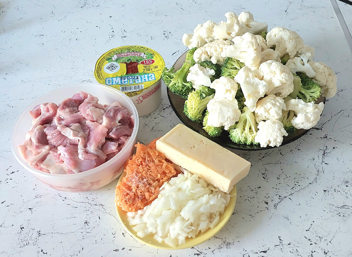Думаю каждая хозяйка придумывала ужин из того, что есть в холодильнике. Вот и я сегодня, наткнулась на половину брокколи и цветной капусты и озадачилась, что же из них приготовить, что бы было вкусно. Получилось и быстро и очень вкусно. Для рецепта нам понадобится: Брокколи/цветная капуста (можно что то одно) Филе бедра индейки Сметана 15% Сыр Лук, морковь, чеснок Специи по вкусу Лук нарезаем на мелкие кубики, морковь натираем на крупной тёрке и отправляем обжариваться в сковороду на небольшом количестве растительного масла. Обжариваем овощи на среднем огне примерно 3-5 минут. Мясо промываем в проточной воде и нарезаем на небольшие кусочки. Отправляем в сковороду. Добавляем соль, перец, чеснок (у меня сушеный) и любимые Специи по вкусу. Я использовала куркуму и хмели сунели. Обжариваем мясо 5- 10 мин на огне чуть больше среднего. Далее добавляем капусту, убавляем огонь на минимум и накрываем крышкой. Оставляем тушиться на 10 минут. Через 10 минут добавляем сметану и натертый на круп