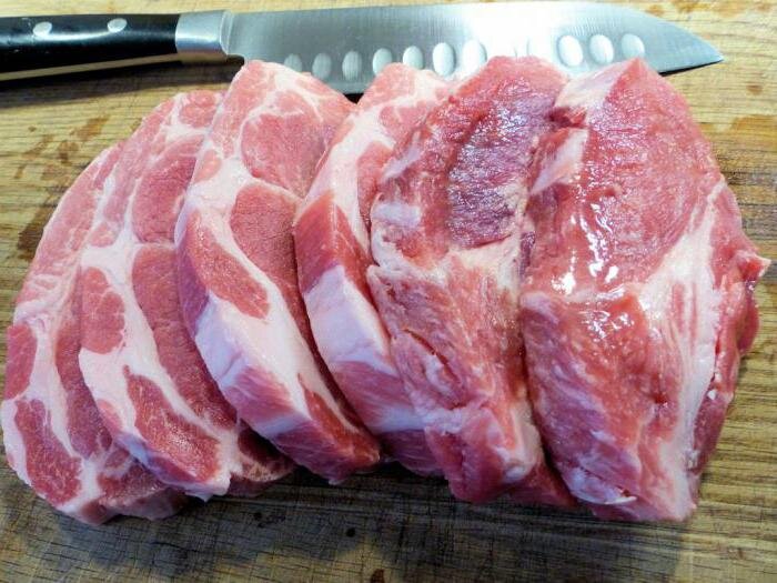 Мясо по-французски из свиной шеи просто и очень вкусно. Свиную шею нарезаем ломтиками шириной примерно 1,5 см Отбиваем мясо с двух сторон. Затем солим, перчим и натираем чесноком, я добавляю еще немного соевого соуса, для меня так вкусней. Оставляю чтобы мясо немного постояло. Приготавливаю грибы, грибы я беру шампиньоны.