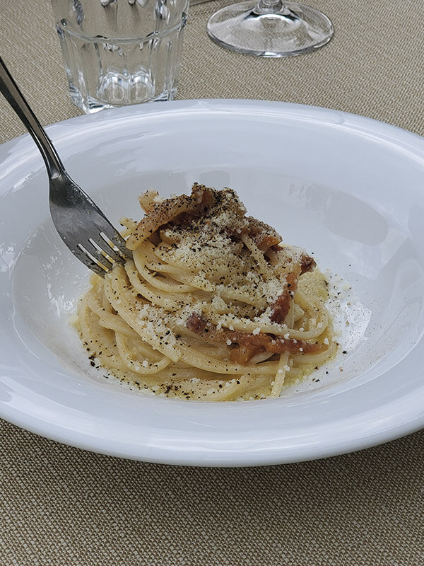 Слейте воду с макарон и добавьте их в яичную смесь, в которую мы добавили гуанчиале.