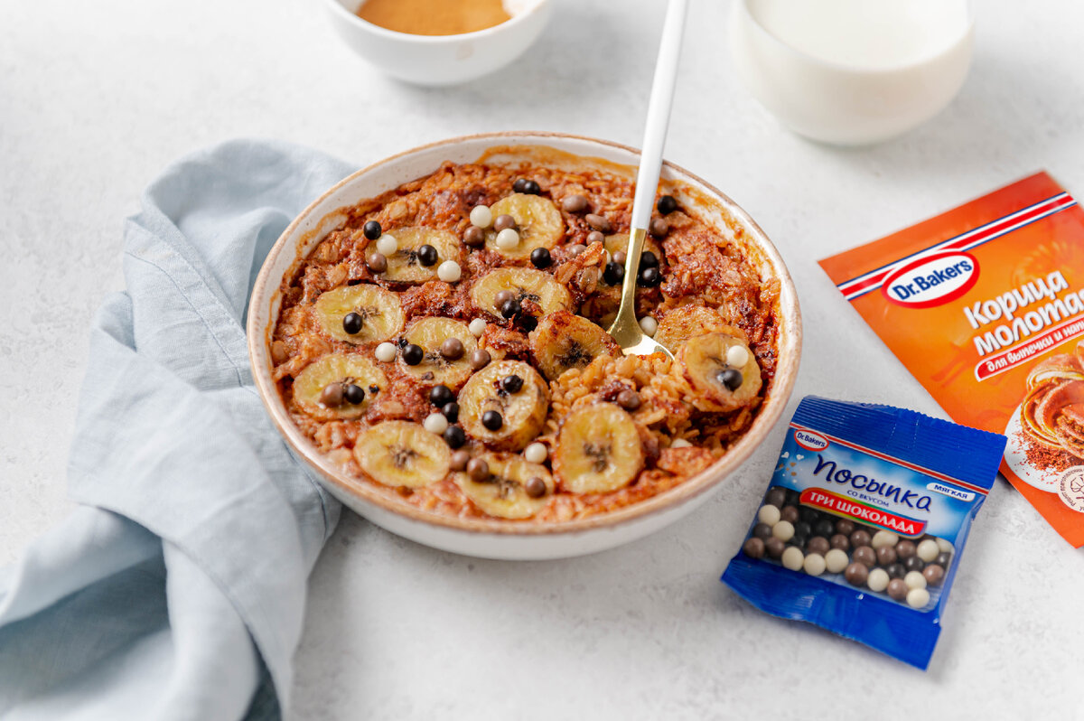 • Посыпка со вкусом «Три шоколада» Dr. Bakers - 1 упаковка 👉 Способ приготовления: ① В чашу кладём овсянку, соль, корицу и разрыхлитель. Всё перемешиваем. ② Отдельно смешиваем молоко, мёд и масло. ③ Соединяем две смеси и перемешиваем. ④ Переливаем смесь в форму для запекания (или жаропрочную тарелку). Банан режем на кружочки и кладём на смесь. ⑤ Ставим в заранее разогретую до 180°C духовку на 25 минут. ⑥ Достаем из духовки и украшаем посыпкой «Три шоколада». --- Приятного аппетита!