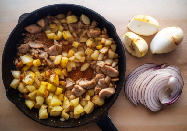 Ингредиенты: Приготовление: В течение процесса готовки не забудьте периодически помешивать, чтобы ингредиенты не пригорели. 7. Добавьте нарезанный картофель, соль, перец и черный перец. Тщательно перемешайте все ингредиенты, чтобы картофель и лук были равномерно покрыты специями. 8. Закройте кастрюлю крышкой и готовьте на среднем огне около 20-25 минут, пока картофель и мясо полностью не станут мягкими. Когда все ингредиенты станут мягкими, выключите огонь и подавайте горячим. Время приготовления: около 30-35 минут.