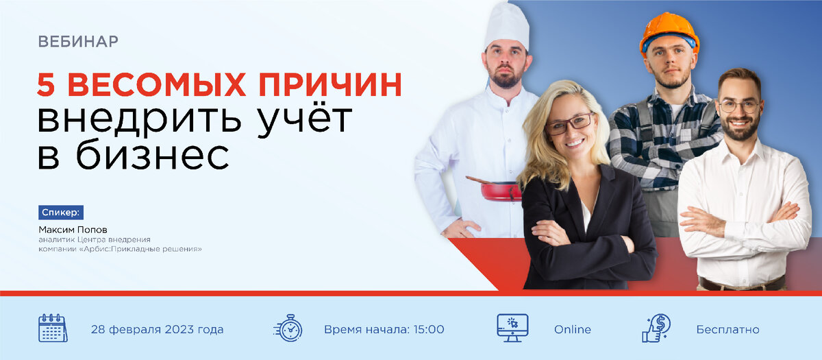 Думаете, что автоматизировать процесс – дорого? Мы готовы познакомить вас с доступным решением, которое избавит вас от рисков и закроет большинство задач по автоматизации учёта! 💻 Совсем скоро Центр внедрений АРБИС проведёт свой вебинар для предпринимателей. Главная тема – продукт 1С, который разработали специально для малого бизнеса: «1С: Управление нашей фирмой». Если коротко, это комплексный продукт, который берёт на себя едва ли не всю бюрократию, с которой сталкивается малый бизнес, хранит коммерческие данные в порядке, помогает вести продажи товаров и услуг в том числе через интернет-магазины, готовить отчётность. 📋 Больше подробностей о продукте, возможностях его внедрения в вашей организации и опыте других бизнесменов вы узнаете на бесплатном вебинаре АРБИС при поддержке @arr29 (Агентства регионального развития). Мы встретимся уже 28 февраля на вебинаре! Но сначала нужно зарегистри