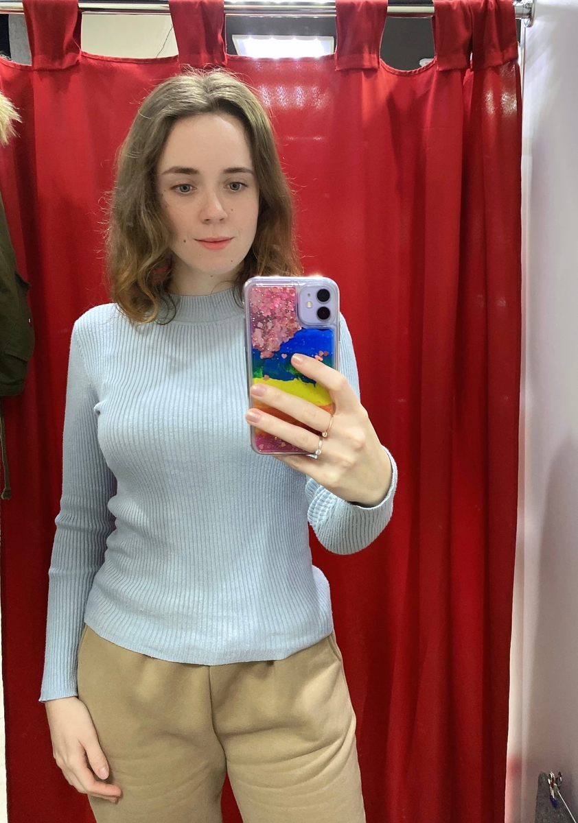 Иногда бывает так, что совершенно случайно попадается вещь, которая потом очень нравится. Подобная ситуация вышла с этой водолазкой. К слову, долго думала, как же эту вещь правильно назвать. То ли водолазка, то ли лонгслив, то ли джемпер... Решила, что пусть будет водолазкой. Подобная одежда у меня периодически появляется, и недавно у меня было два джемпера. Оба их выбросила, так как показалось, что они уже не выглядят как раньше. Так что эта водолазка оказалась очень даже кстати. Взяла я её, чтобы примерить две куртки в секонд-хенде. Я тогда была в объёмном худи, поэтому весенние курточки на него просто не налезали. В итоге мне понравилась эта водолазка, да и цвет очень даже приятный. Конечно, не под такие штаны носить, но в целом понятно, как она выглядит. Материал приятный, хотя и синтетика - вискоза + эластан. Купила вещь всего за 50 рублей. Вот так водолазка выглядит на мне. Изначально не стремился создать какой-либо образ, так как нужно было быстро съездить в магазин. Решила в