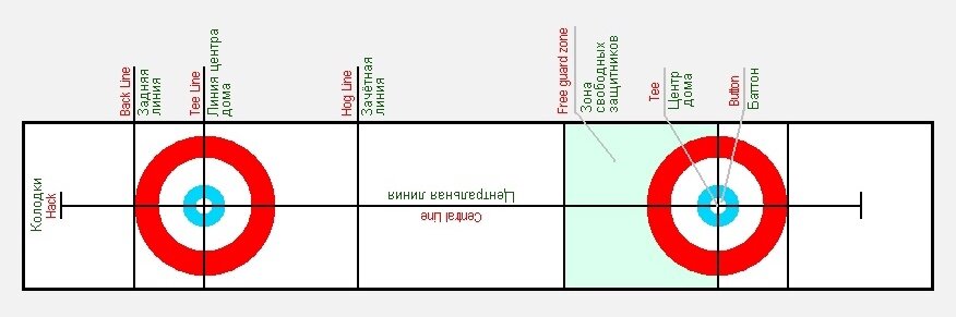 Линия центра дома — поперечно пересекающая центр «дома», параллельно хог-лайн. После пересечения камнем ти-лайн противник может начинать свиповать для облегчения его выхода из дома. 4. Хог-лайн (hog line) или зачётная линия