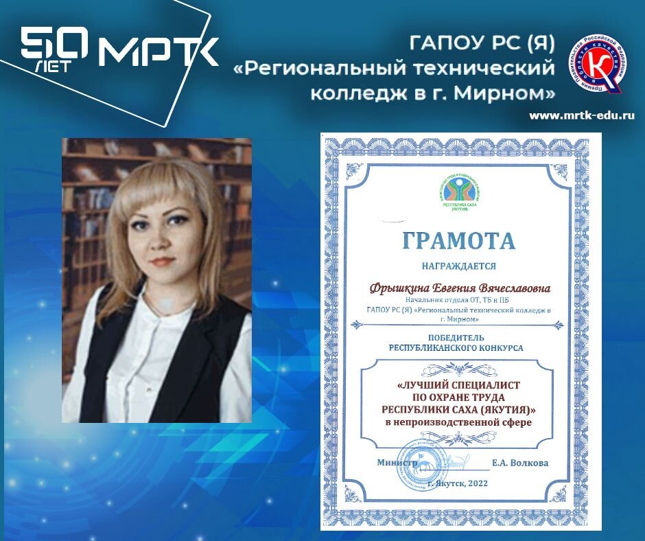 Министерство труда и социального развития РС (Я) наградило победителя республиканского конкурса "Лучший специалист по охране труда". Министерство труда и социального развития РС (Я) наградило победителя республиканского конкурса «Лучший специалист по охране труда» Республики Саха (Якутия) в непроизводственной сфере - Евгению Фрышкину, начальника отдела охраны труда, техники безопасности и пожарной безопасности "Мирнинского регионального технического колледжа". От всей души поздравляем коллегу, желаем новых побед и свершений, благополучия в сфере охраны труда! Пресс-служба ГАПОУ РС (Я) «Региональный технический колледж в г. Мирном». #МРТК #Мирнинскийколледж #РегиональныйтехническийколледжвМирном #СПО #Якутия #Мирнинскийрайон #Мирный #Образование #Охранатруда Ссылки на публикации: