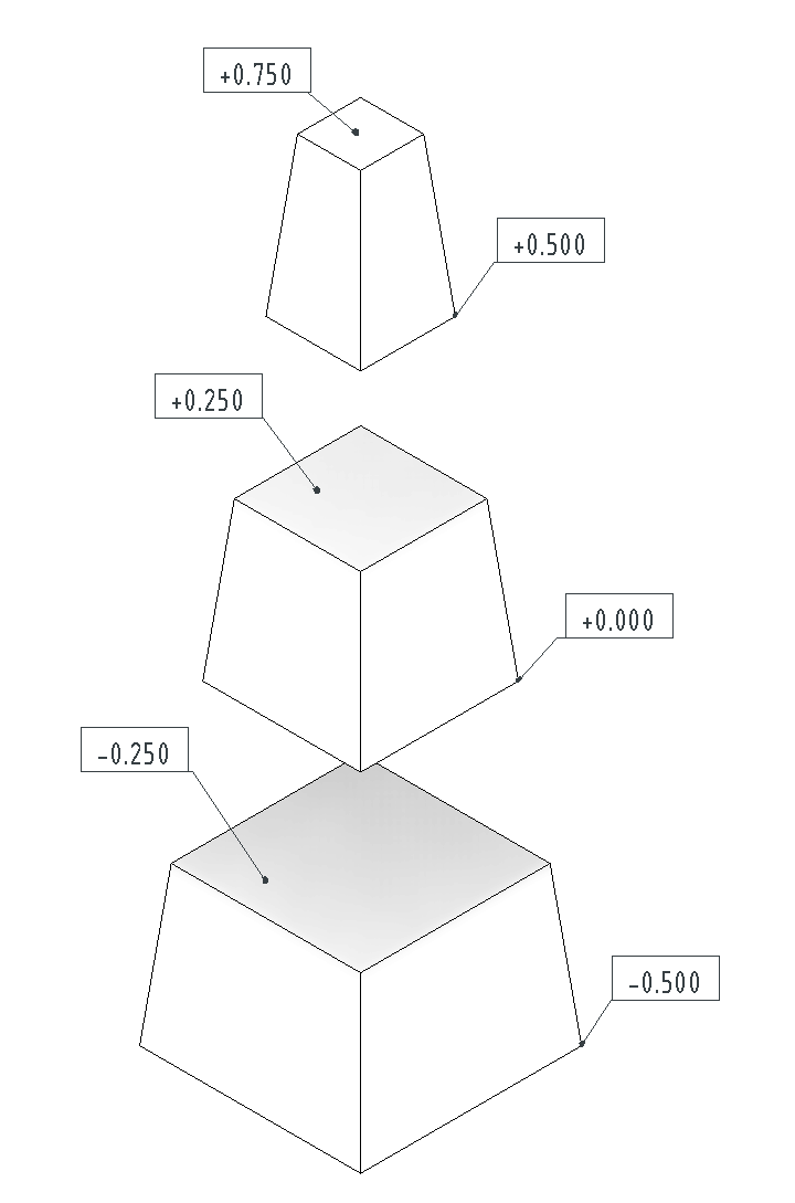 В первую очередь нужно разобраться с секущей плоскостью вида и плоскостями отсечения. Для этого построим простенькую модель из трех усеченный пирамид различных размеров на различных отметках.