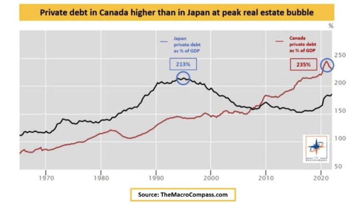 Однако учитывая, что это все же страна из G7 с немаловажным положением в построенной мировой финансовой пирамиде, каждый кирпичик как говорится на счету и на виду. На иллюстрации (выше) видно, что отношение частного долга к ВВП у Канады уже выше, чем был у Японии на пике японского жилищного пузыря.
