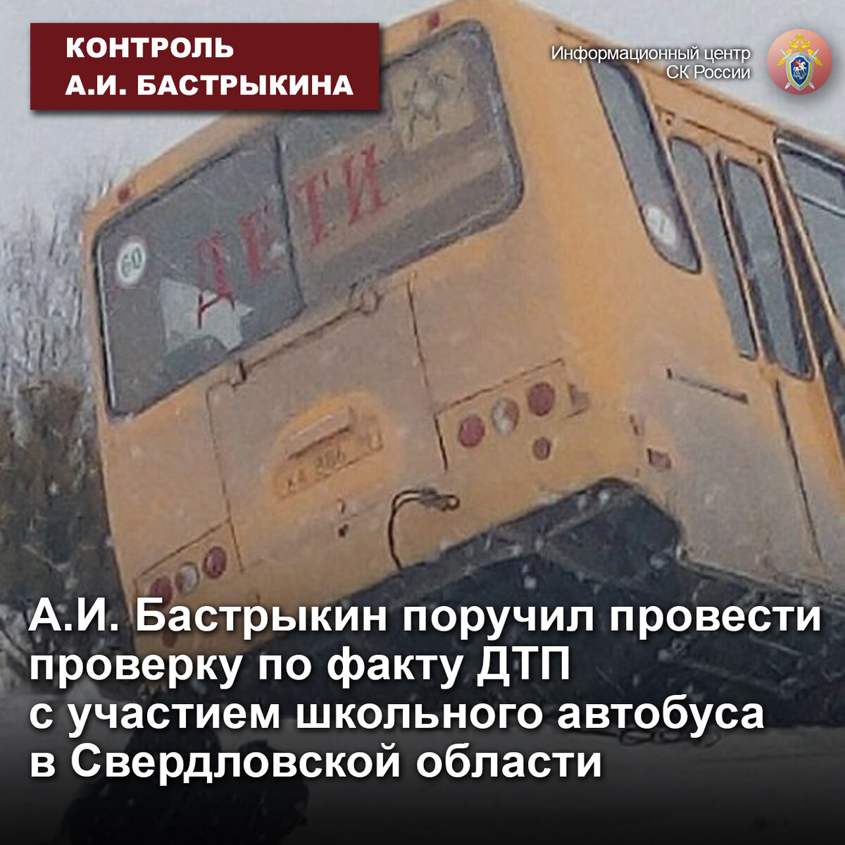 В СМИ сообщается о произошедшем 6 февраля текущего года в Туринском районе Свердловской области ДТП с участием школьного автобуса, в котором находилось 18 детей. На автодороге водитель не справился с управлением транспортным средством, допустил его съезд в кювет и опрокидывание.