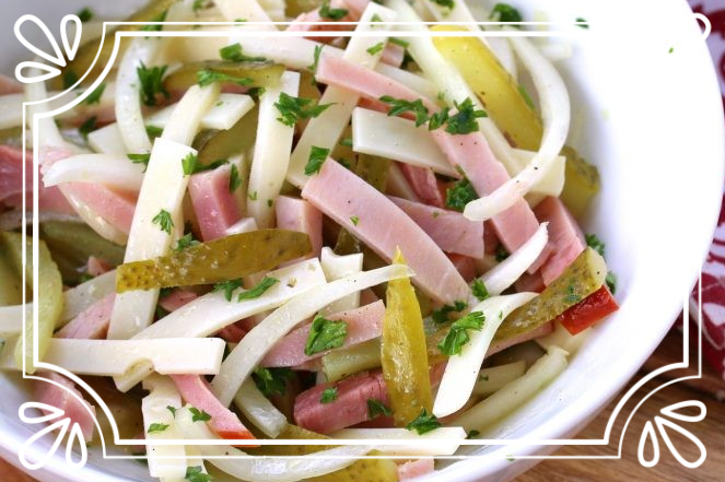 Луковицу нашинковать и ошпарить кипятком уложив в сито, вареную колбасу, подойдёт докторская, нарезать соломкой, соленые огурцы очистить и нашинковать. Все это смешать и заправить оливковым маслом, добавить уксуса, горчицы, немного перца и соли(по вкусу) и зелени.