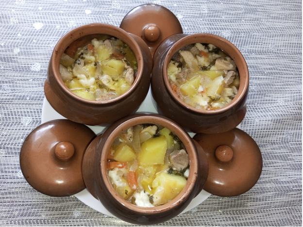 У многих горшочки просто стоят и пылятся в шкафах, а зря, столько всего можно приготовить в горшочках. Хочу предложить самый простой вариант приготовления. Ингредиенты на 4 горшочка: - мясо – примерно 400 гр. свинина или куриная грудка, на фото свинина; - картофель – 4 шт. средних клубня; - репчатый лук – 1 шт.; - морковь – 1 шт.; - сырки дружба – 2 шт.; - грибы – по желанию, можно использовать как обжаренные свежие шампиньоны, так и размоченные сухие грибы. На фото я использовала по 0.5 ч. ложки в каждом горшочке перемолотых сушеных грибов; - соль по вкусу; - перец черный молотый – по вкусу; - зелень – по вкусу и желанию; - растительное масло для обжаривания мяса. Очищенный и нарезанный крупными кусочками картофель уложила на дно горшочков. Сверху нарезанный лук и морковь. Далее добавила слегка обжаренное нарезанное мясо. Посолила, поперчила, добавила измельченные сушеные грибы, влила в каждый горшочек воды на половину содержимого, сырки порезала кубиками уложив в каждый горшочек по п