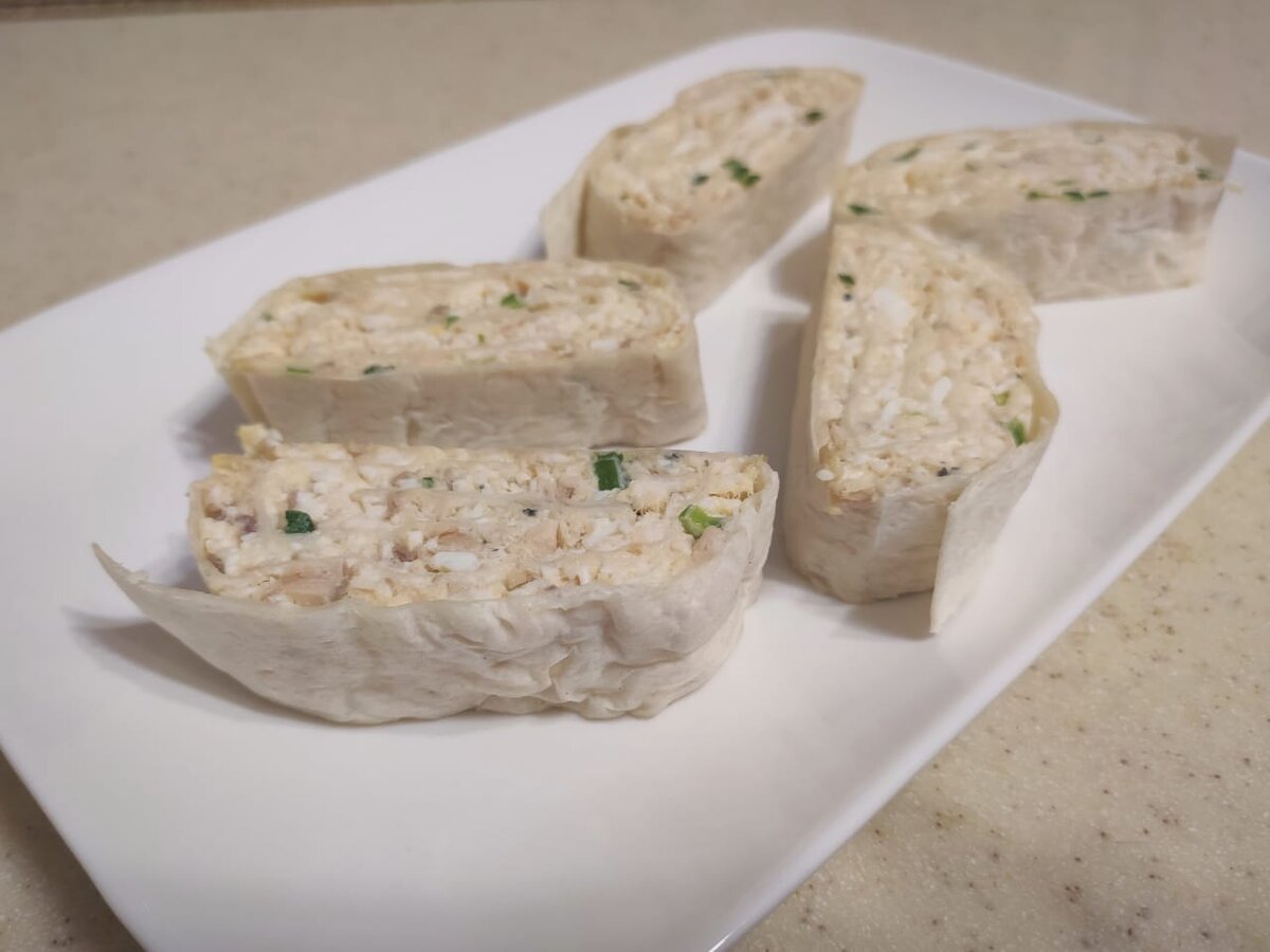 Ингредиенты: Приготовление: 1. Откиньте тунца на сито, чтобы стекла жидкость. Переложите в миску. 2. Очистите яйца и мелко нарежьте. 3. Плавленый сыр натрите на терке. Он придаст начинке для лаваша сливочный вкус. 4. Мелко нарежьте петрушку и зеленый лук. Смешайте все подготовленные ингредиенты. 5. Разложите лаваш и равномерно выложите на него начинку. Сверните в плотный ролл и разрежьте пополам. Для подачи каждую порцию заверните в пергамент. Будете готовить?