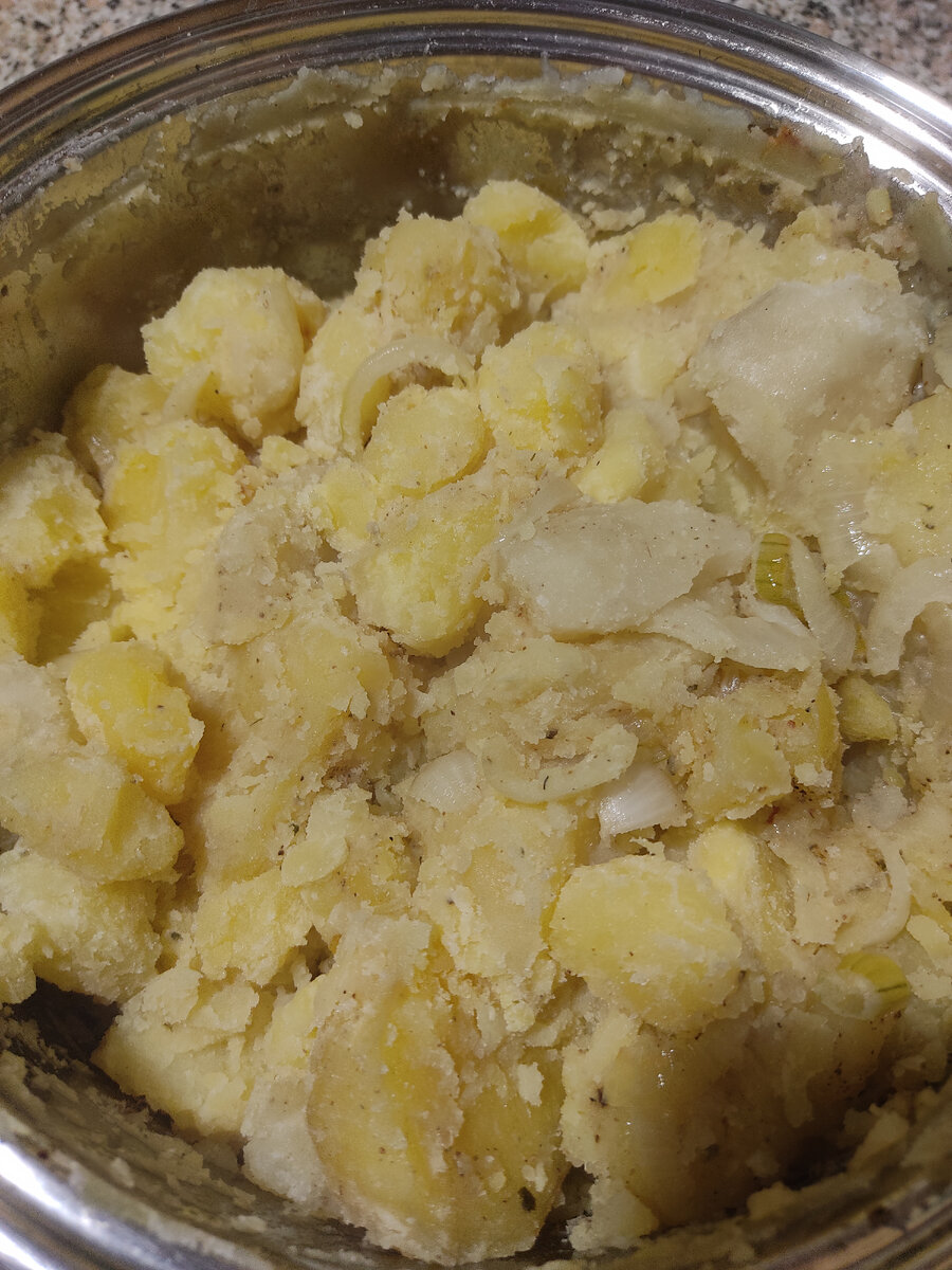 Наливаем в кастрюлю немного воды (примерно 3 см.), закидываем в кастрюлю картошку, ставим на маленькую конфорку на максимальный огонь. Варим до закипания. Как картошка закипит, уменьшаем огонь на минимум. Пока картошка варится, чистим и нарезаем пару средних луковиц полукольцами. Разогреваем сковородку, кидаем масло сливочное (50 - 70 гр.). Выкладываем лук на сковородку и жарим до золотистого цвета. Как только картошка сварилась (варится она примерно 40 мин.), необходимо слить воду. Закидываем поджаренный лук к картошке в кастрюлю. Добавляем соль и специи по вкусу (у нас это адыгейская соль 2 чайные ложки с верхом) Накрываем плотно крышкой, кладем полотенце сверху и активно трясем кастрюлю. Картошечка готова! Приятного аппетита!