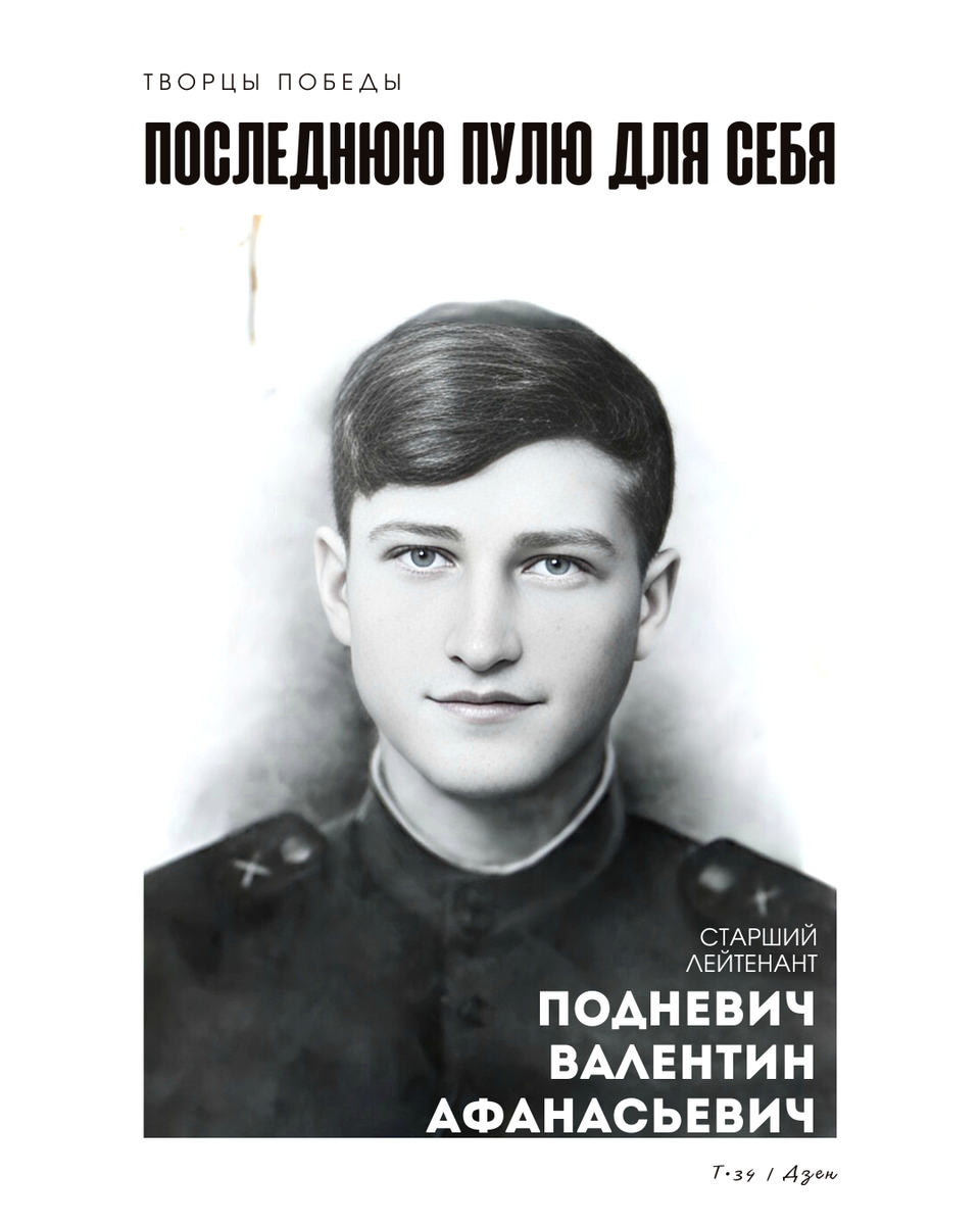 ...Мальчишка в ушанке. Ясные, лучистые глаза. Курсантские петлицы. Он смотрит на нас в упор. Послушайте тишину: «Я Валентин Подневич из Новосибирска, мне 18 лет. Вчера принесли похоронную на брата, а через несколько дней я уже был у проходной Томского военного училища. Было трудно, но там, на фронте, было еще труднее. Учились — как воевали, шли на занятия — как в бой. А потом была настоящая война. И ушел я на нее, чтобы победить и вернуться...» Не знал, не думал Валентин, что пройдет совсем немного времени, и он войдет в бессмертие, ибо был этот мальчишка настоящим человеком. В бою под украинским городом Черкассы у села Кирилловка до последнего солдата вела бой батарея Подневича.