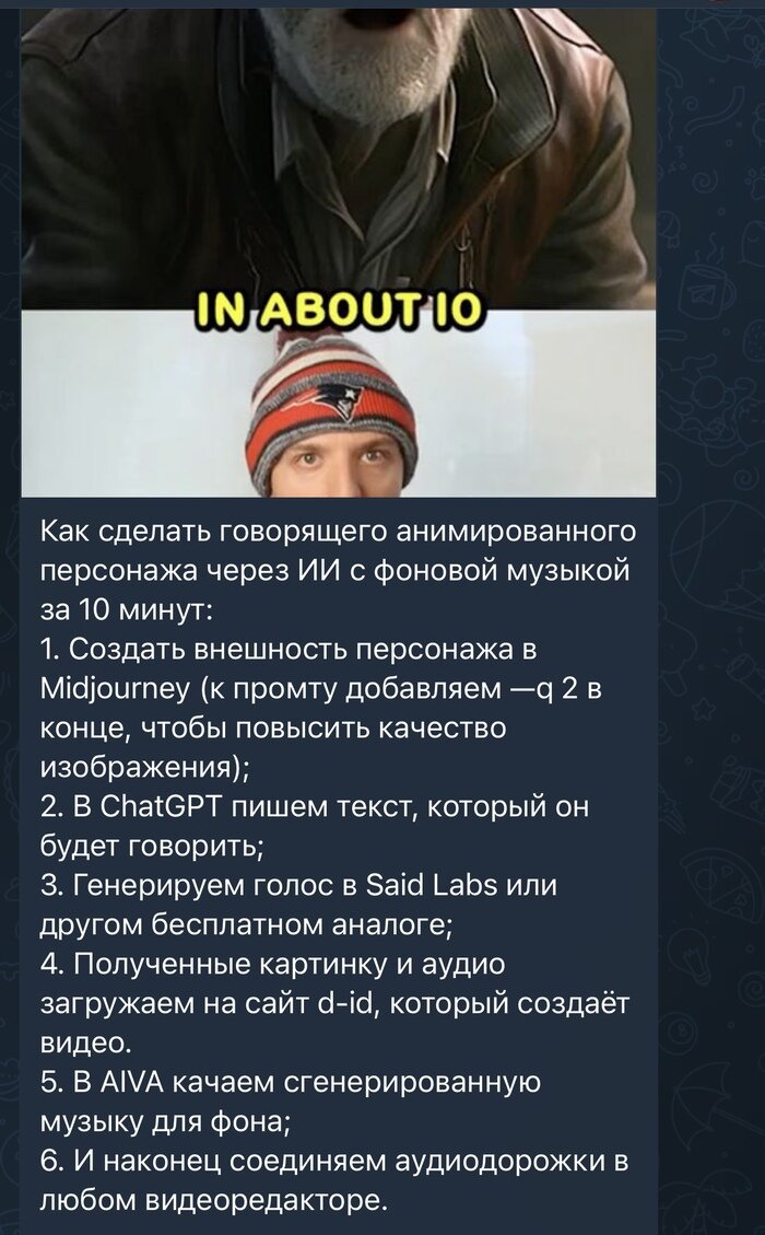 Текст нужно озвучить так что ищем сайт который может это сделать. Получаем аудио файл. Затем генерируем портрет с помощью midjorney по запросу (если на русском):женский портрет человека но с чертами дракона и мыши одновременно".