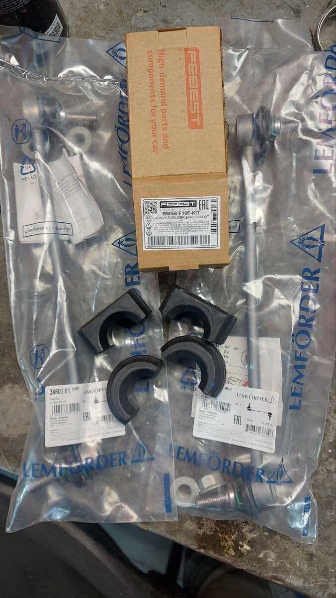 Сегодня ко мне обратился клиент с проблемой неприятного звука при проезде по лежачим полицейским на своем автомобиле BMW 5 F10. При диагностике было выявлено, что скрипит втулка стабилизатора из-за того, что она износилась. Я решил установить ремонтные втулки стабилизатора и новые стойки. Производителем регламентируется замена стабилизаторов в сборе: втулки припаяны к стабилизатору и как отдельная запчасть не продаются в оригинале. Но отдельно их можно купить в составе ремкомплекта иных производителей, то есть не оригинал. С клиентом мы всё обсудили. Я в таких случаях как и производитель рекомендую менять всё в сборе, так как это увеличит срок службы стабилизатора и втулок больше чем на 100000км. Если же установить ремкомплект, то до 30000км. Цена на стабилизатор - от 30000 рублей Цена на ремкомплект - от 1500 рублей Но клиент решил сэкономить на ремонте и выбрал вариант установки ремкомплекта. Я приобрёл запчасти: втулки и стойки стабилизатора. Смотрите на фото. Процесс ре