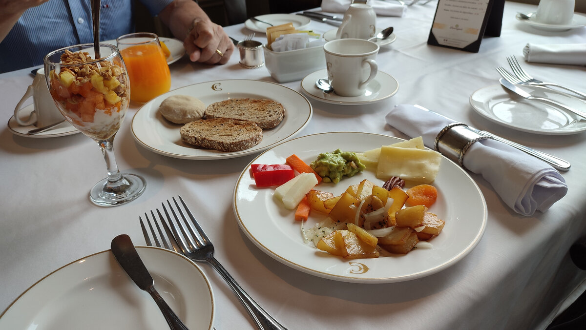 Проснулась, как будто не спала. Теперь не ухо, теперь горло😀 Думала, что откажусь от поездки. Но потом поняла, что лучше лежать в красивом номере отеля, в тишине, вдыхать морской воздух, любоваться на фламинго, не готовить завтраки/обеды/ужины, чем лежать в шумной городской квартире и делать ежедневную рутину. Про «лежать», это если вдруг простуда начнёт прогрессировать. На момент выезда, «клиент» скорее жив и бодр, чем обратное. Надеюсь, что всё обойдётся и я не разболеюсь. Завтрак Праздничное утро началось с завтрака в красивом месте. Так мы задумали. А после завтрака выехали в Паракас. В дороге На улице солнце, в машине жарко, включать кондиционер на полную катушку боюсь. Окна открыть невозможно, мы в пробке. Выезжаем из города уже целый час, паримся в салоне. Выехали на трассу. Открыли окна, можно дышать. А вот и заправка. Подкачали колёса, заправили машину. Хорхе купил себе мороженое, а мне воды и сосательные леденцы. На трассе всех подряд останавливали стражи порядка. Ког