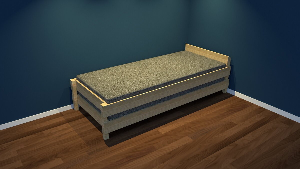 Недавно услышал про такую штуку как штабелируемая кровать и настолько преисполнился простотой и гениальностью этой идеи, что сразу решил нарисовать. Идея в том, чтобы несколько кроватей собрать в вертикальную конструкцию для удобного хранения. При этом верхней кроватью можно полноценно пользоваться, а нижние доставать тогда, когда нужно организовать дополнительные спальные места. Количество кроватей неограниченно, можно грузить друг на друга хоть до потолка. Но для сна больше трех использовать не удобно. Размер спального места я решил взять стандартный - 900х2000. Высота одной кровати 230 мм без учета выступающей наверх части матраса. Две кровати имеют высоту 440 мм - это примерно стандартная высота обычной спальной кровати. Три кровати составляют высоту 650 мм. Теперь по материалу. Кровати делятся на два вида. Верхняя и все остальные. Верхняя кровать для удобства постоянного использования имеет небольшой подголовник. Высоту матраса для кровати я заложил в 120 мм, если толщина матрас