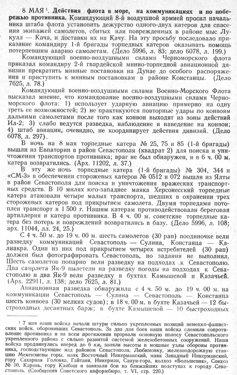 В ночь на 8 мая три торпедных катера 1-й бригады (№25, 75, 84) вышли из Евпатории, и…, ничего не найдя вернулись.