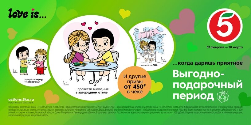 В преддверии главного романтического праздника года — Дня всех влюблённых, а также 23 Февраля и 8 Марта торговая сеть «Пятёрочка» запустила новую акцию с тремя тысячами призов. Для участия омичам достаточно совершить покупку на сумму от 450 рублей в любом из магазинов сети. После этого вы получите одну из уникальных электронных открыток, сделанных в стилистике вкладышей легендарной жевательной резинки. Всего в серии — 10 открыток, ими можно будет легко поделиться с друзьями через мессенджеры. В ходе акции «Пятёрочка» будет разыгрывать ценные призы — подарочные карты, сертификаты в салоны красоты, путёвки в загородные отели, умные часы, планшеты, смартфоны и смарт-телевизор. Для участия в этих розыгрышах нужно будет выполнить дополнительные условия — регистрировать чеки от покупок на сайте actions.5ka.ru, покупать определённые товары в определённые дни и т.д. Узнать подробности можно на сайте акции. Участвует в акции и необычный — парный — приз. Для того, чтобы за него побороться, доста