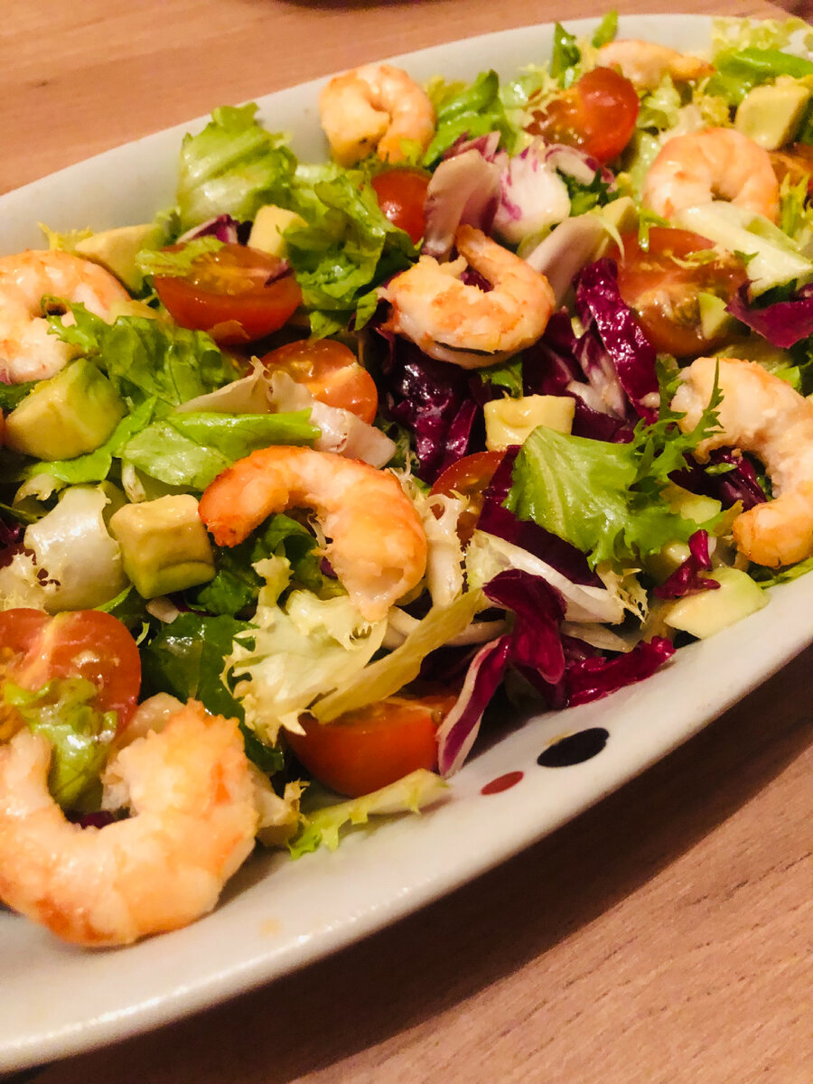 Приветствую всех на своём канале! Если любите лёгкие и яркие блюда, то рекомендую попробовать этот салат. Внешний вид вызывает положительные эмоции, смотришь и есть жалко. Всё гармонично и вкусно. Ингредиенты: -микс салатных листьев; -авокадо; -креветки крупные; -помидоры Черри. Заправка: -оливковое масло- 2 ст. л.; -соевый соус-1 ст. л.; -кунжутный соус-1 ст. л.; -сок лимона -1/2 ч. л.; -соль, перец ( по вкусу). Микс салатных листьев промыла, просушила и выложила в салатник. Мякоть авокадо нарезала на кусочки, а черри разрезала пополам. Креветки обжарила на сливочном масле и добавила в салат. Всё заправила соусом . Кто любит экзотическую нотку или фрукты в салате, можно добавить мякоть апельсина или консервированные ананасы. Салат готов. Приятного аппетита! Спасибо , что зашли на мой канал!