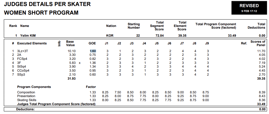 Лидирует по итогам короткой программы представительница Южной Кореи Ким Йе Рим, накатавшая на свой лучший результат сезона - 72,84. На разминке у неё возникли проблемы с каскадом 3Л+3Т, но в самом прокате он был исполнен уверенно и на хорошие плюсовые ГОЕ (+1.60). Качественные непрыжковые, всё на четвертый уровень, только финальное вращение бригада пересмотрела на третий. Нежный, чувственный, красивый прокат. Видео (без впн не доступно): Если то видео не доступно, можно посмотреть запись с трибуны: Протокол: Вторую строчку занимает Изабо Левито. В отличие от кореянки она прыгала каскад 3Л+3Т во второй половине, однако на тулупе у неё был солидный недокрут. Причем его было отлично видно и во время проката, и в повторе, где элемент был показан с другого ракурса. В протоколе между тем недокрут не стоит, но ГОЕ не высокие (+0.84). В целом прыжки у