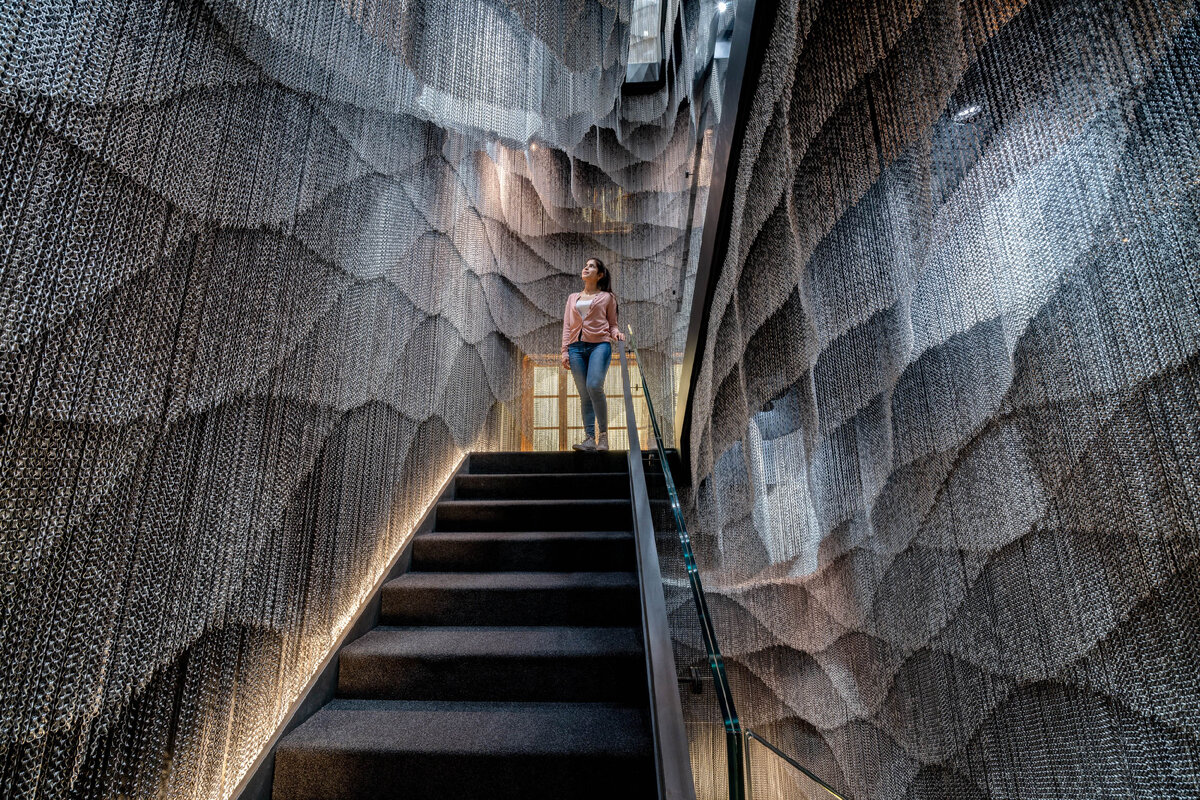 Эта лестница от Kengo Kuma and Associates , окруженная скульптурными занавесками из металлической сетки, расположена в отреставрированном Доме Бальо (Casa Batlló) Антонио Гауди в Барселоне. Японский архитектор покрыл пространство вокруг лестницы и атриума алюминиевыми цепями, которые меняют длину и цвет по мере подъема.