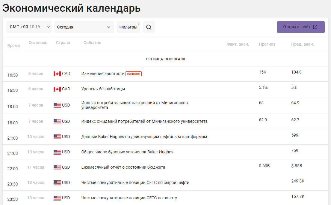 Фон рынка: Доллар удерживает позиции в пятницу, поскольку инвесторы не проявляли аппетита к риску в преддверии выхода инфляционных показателей США на следующей неделе, а опасения по поводу замедления экономического роста и темпов повышения ставок Федеральной резервной системой оказали давление на настроения. Инвесторы продолжают оценивать риски дальнейшего ужесточения политики ФРС после сильных показателей рынка труда США и готовятся к публикации во вторник январской американской инфляционной статистики, которая поможет понять возможные шаги Федрезерва на ближайших заседаниях. Обзор экономических событий: Сегодня стоит обратить внимание на публикацию данных по занятости в Канаде. Ожидание негативные, поэтому цена на CAD сегодня может снизиться. В США опубликуют индекс ожиданий от Мичиганского университета. Ожидания умеренно позитивные, поэтому у покупателей Доллара США вполне могут быть повод продолжить покупки. ===================================================
