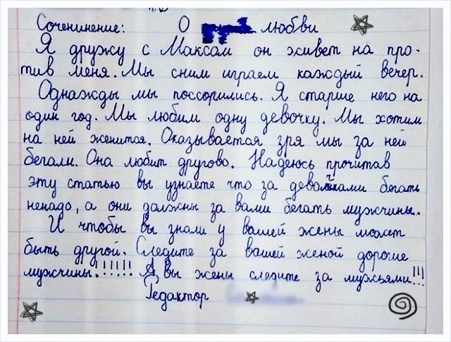 У слова "любовь", наверное, больше всего синонимов. Каждый по-своему может описать это чувство и состояние. И самое удивительное то, что все окажутся правы. Однажды у детей спросили, что такое любовь. И их ответ в основном основывался на личных наблюдениях. Вот вам два примера: Но детская непосредственность в таких ответах может не только умилять :) Некоторые дети уже в раннем возрасте успевают столкнуться с безответной любовью, и тогда они становятся поистине прожженными психологами. Сегодня хочу показать вам 7 новых записок и сочинений от детей, которые знают о любви больше всех. 7 Забавных записок про любовь Когда стал опытнее своих сверстников. Интересно, как бы они решили проблему, если бы девочка оказалась свободной. Дуэль? Дружбе конец. Или нафиг такую девочку, из-за которой можно потерять друга. Бабушке на Чапаева стоит приготовиться. Ведь, если заболеет и Даша, то наверняка есть еще запасной аэродром. Когда последняя фраза перечеркивает все, что было сказано ДО :) P.s. "Очень