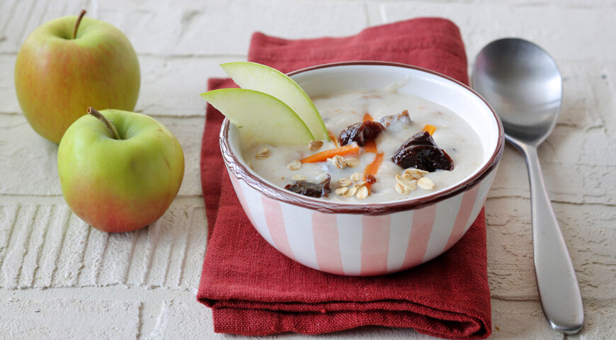 Думаете, ничего полезного не бывает вкусным?😉 Овсяные хлопья входят в состав многих лечебных диет, но это не значит, что вы должны каждый день есть неаппетитную, безвкусную, странно окрашенную кашу. Кроме того, польза увеличивается втрое благодаря яблокам, моркови и черносливу. ИНГРЕДИЕНТЫ: ПОШАГОВЫЙ РЕЦЕПТ ⬇️ Шаг 1. Чернослив замочите в теплой кипяченой воде на 15 мин., откиньте на дуршлаг и мелко нарежьте. Морковь и яблоко очистите, нарежьте соломкой и сбрызните лимонным соком. Сложите чернослив, яблоко и морковь в сотейник, добавьте 5 ст. л. воды и тушите на среднем огне до мягкости, 10 мин. Шаг 2. Овсяные хлопья залейте кипящим бульоном или подсоленной бутилированной водой, варите 7 мин. Протрите вместе с отваром через мелкое сито. Шаг 3. Добавьте в суп подготовленные чернослив, яблоко и морковь, ореховое масло, соль и перец. Перемешайте, доведите до кипения и сразу же снимите с огня. кбжу 👍 КСТАТИ Попробуйте приготовить этот суп с ржаными хлопьями. Их можно купить в некот