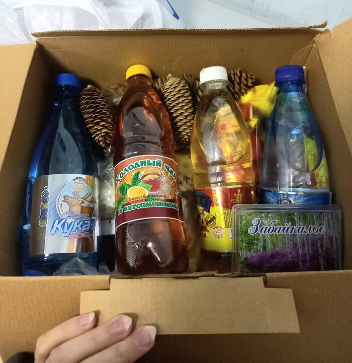 Угомониться с новогодними обменами я не смогла, поэтому договорилась в комментариях об обмене аж с самого Забайкальского края! Небольшой e-mail тет-а-тет об общих предпочтениях, вытягивание клещами из собеседника подробностей, и тщательно обмозгованный выбор подарков. И мучительной процесс ожидания посылочки из далёкого далёка, скрашенный милым фото сбора для меня запчастей подарка: D А потом согласование рабочего графика меня и почты и вот оно... 4 с лишним кг, которые мне предстояло тащить на горбу на работу (домой она так и не доехала)) Фото было делать максимально никак, но я смогла) Посмотрите только, сколько всего!!! Блин, вода очень вкусная!) Вот не сравнить с нашим "невским бульончиком", а лимонад по вкусу как в детстве) Шишечки, собранные специально для меня с самой красивой забайкальской ёлки) Они, кстати не совсем обычные, я таких по форме в ЛО точно не видела, и цвет другой. А ещё помимо шишек были мои любимые кедровые орешки - целый мешок! Вместе с кедровой шишкой) А дааал