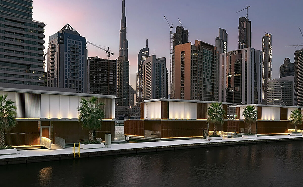 Гостиница «Marasi Water Homes» в Дубае представляет собой комплекс домов, установленных на плавучих платформах. Платформы с домами были изготовлены в Финляндии, а затем отбуксированы в Дубай морским путем. Проект гостиницы разработан архитектурной компанией «A +U». Особенности эксплуатации в морском климате потребовали применения материалов, особо устойчивых к внешним воздействиям. Архитектурная компания использовала для фасадов зданий термодревесину – материал, способный длительное время сохранять свои технические и эстетические качества даже в самых неблагоприятных условиях. Как утверждают сами разработчики, решение использовать для отделки фасадов древесину было принципиальным, т.к. дерево – самый экологичный материал. Особо важным, считают авторы проекта, является то, что в процессе своего роста деревья улучшают природную среду, поглощая углекислый газ и выделяя кислород. Термодревесина долговечна и устойчива к воздействию морского климата. Термообработка древесины осуществляется б