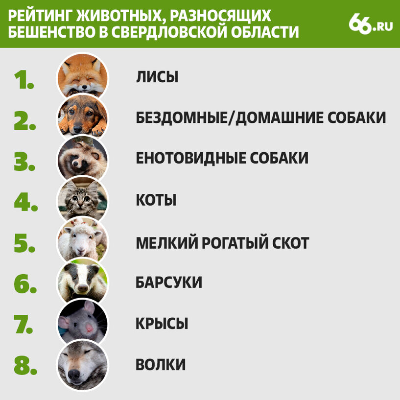 По данным регионального департамента ветеринарии, чаще всего бешенство в области разносят лисы (40 случаев за последние четыре года и один месяц). Следом идут: домашние или бездомные собаки (11 случаев), енотовидные собаки (семь случаев), коты (два случая), мелкий рогатый скот, барсуки, крысы и волки (по одному случаю). Отличить больное животное от здорового несложно. Бешенство характеризуется агрессивным поведением, слюнотечением и параличами. Зараженные особи ведут себя нехарактерно для диких животных. Например, в природном парке «Бажовские места» волчица пыталась перегрызть железный забор. Специалисты советуют не контактировать с дикими животными и уточняют, что у больных бешенством особей отсутствует страх, поэтому зверь может близко подойти к человеку и даже разрешить себя погладить. В случае, если вас укусило больное животное, нужно сразу обратиться в медорганизацию за срочной помощью. Чтобы домашние питомцы не заразились бешенством, в департаменте ветеринарии советуют их регуляр
