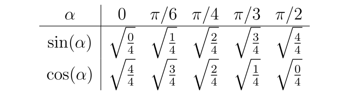 Уверен, многие из вас, дорогие читатели, встречали этот симпатичный способ запомнить табличные значения тригометрических функций, синуса и косинуса, в первой четверти:
