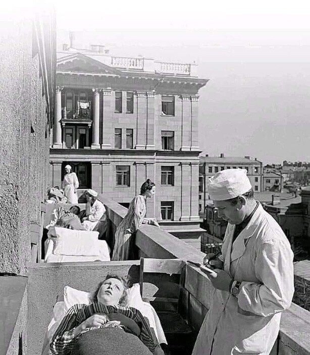 Пациенты Государственного центрального института курортологии на Новинском бульваре принимают воздушные ванны