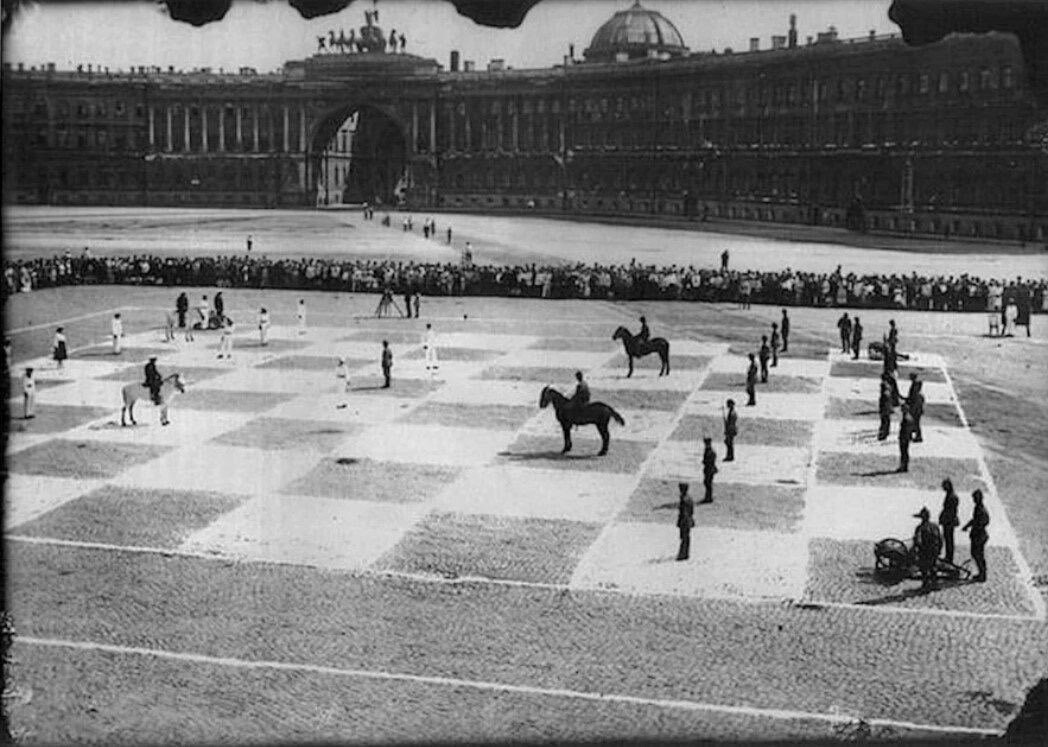 Пётр Романовский и Илья Рабинович играют в живые шахматы на Дворцовой площади, Ленинград, 1924