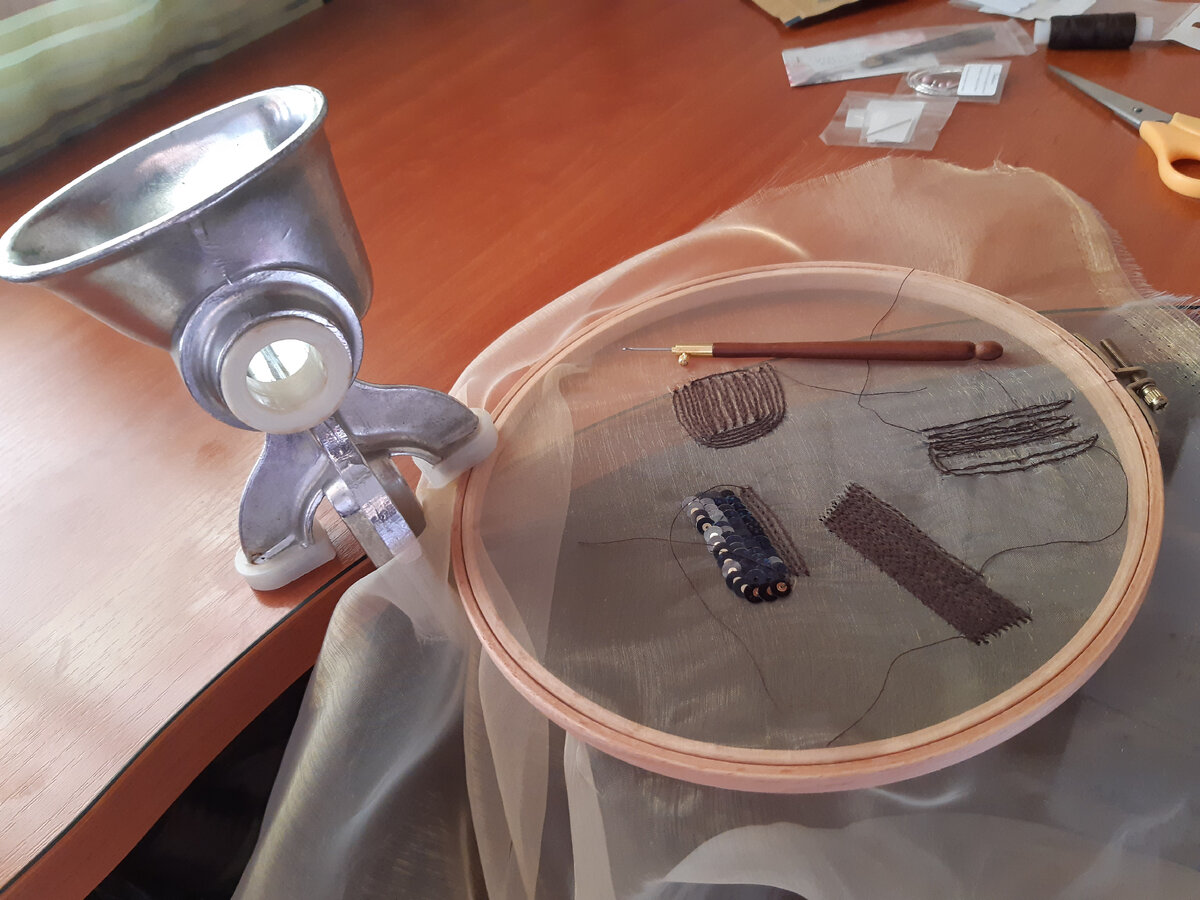 Когда не знаешь, за что хвататься - мастер-класс не смонтирован, фотографии в деле не сделаны, джемпер-водолазка лежит позабытым, и для нового вышивания не закуплены все инструменты (даже и не догадалась, что нужны будут струбцины), а дома все болеют вирусом с небольшим интервалом, даже муж, пока кроме меня.... В таком случае приходит на помощь все то, что есть дома и давно лежит без дела, а именно: Ручная мясорубка и пяльцы - возможно ли сочетать? Да легко))))) Друзья, всем отличных выходных, не болейте и берегите друг друга!!! Поделитесь, что у вас было необычного в применении в подспорье (когда очень надо срочно, но нет такой возможности)?