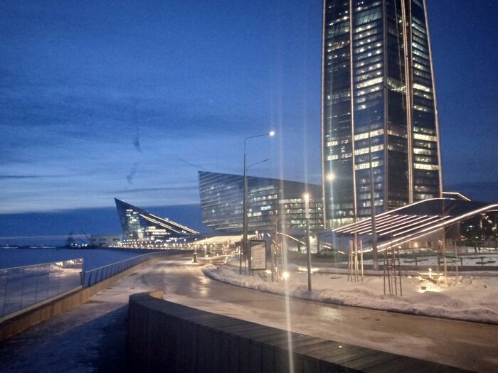 Первый пост тут - По набережной Лахта-Центра. На этот раз я все-таки выбрался в вечернее время, практически после заката, но еще когда с одной стороны - есть хоть какой-то естественный свет, с другой - уже включена подсветка. Как и раньше - дойти с стороны Приморского шоссе. С стороны моста - забор и закрыто...но ушлые люди все-равно смогли найти щель и протоптать тропинку. Но,яж приличный" так что - вокруг. Да и возможность посмотреть поближе - упускать не хотелось. Во первых - очень много людей. Правда, видимо строителей и отделочников. Видимо конец рабочего дня, так что подъезды к центру были весьма плотно (читай: хаотично) запаркованы, а на заледелых тротуарах и дорожках - поток идущих людей. Во-вторых, можно было посмотреть на внутреннюю часть корпуса здания. Однако из-за весьма грязного стекла это было несколько...сложновато. Сфера "планетария" довольно сильно терялась. В остальных корпусах - кипит работа. Даже не смотря на то, что время уже сильно ушло за 18: 30 - на почти всех
