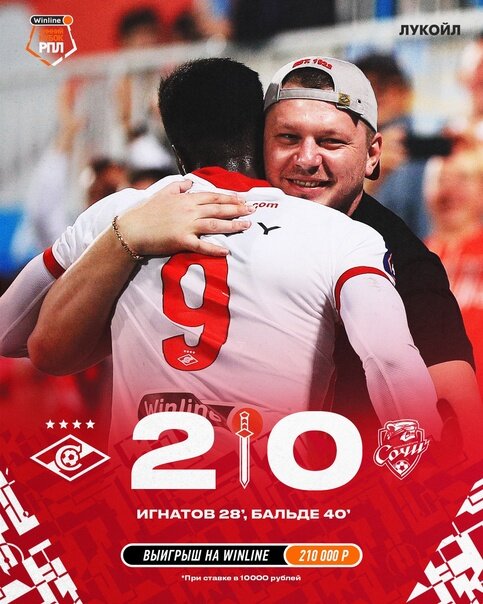 Первый гол Московский Спартак забил на 26 минуте матча.Первый гол забил Михаил Игнатов(22) с передачи Кейта Бальде(9). Михаил реализовал выход 1 на 1 с вратарем ПФК Сочи Денисом Адамовом(1). Второй мяч забил Кейта Бальде(9) на 38 минуте матча.Гол был забит с помощью изумительной передачи Даниила Пруцева(25) с центра поля на правый край поля где находился Михаил Игнатов(22).Михаил обработал мяч пробежал с мячом метров 5 и отдал на Кейта Бальде,а тот не мог воспользоваться этим моментом и забил гол. В конце первого тайма на 45 минуте ПФК Сочи забил гол ,но его незащитали из-за того что Георгий Мелкадзе(9) наступил на ногу вратарю Московского Спартака Александру Максименко(98) счет 2-0. Второй тайм прошел без результативных действий,но моменты были и у Спартака и у ПФК Сочи.Самый опасный момент за тайм был у Александра Соболева(7)на 84 минуте матча. СПАРТАК ПЕРВЫЙ ПОБЕДИТЕЛь ЗИМНЕГО КУБКА WINLINE! Спартак за победу в кубке получит 7000000 млн.рублей.