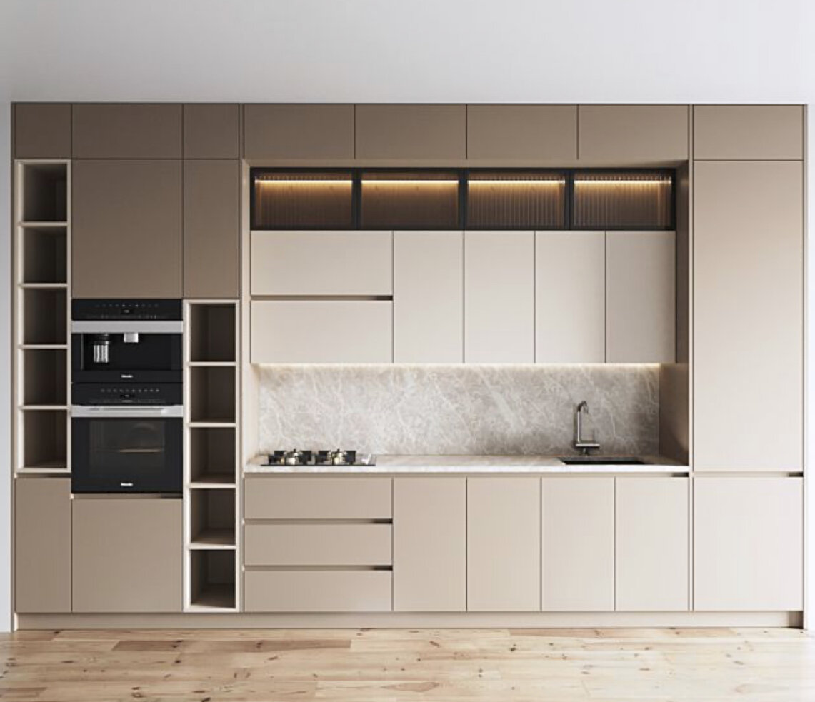 Все Фасады и Пеналы: МДФ (толщина: 22 мм) в Эмали по Ral с интегрированной ручкой (J-ручка). В Мдф-плите меньшей толщины не получится реализовать подобную ручку!