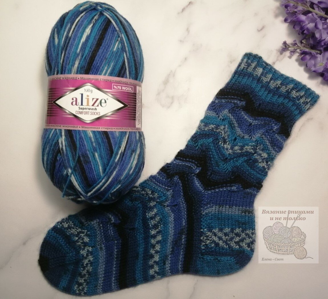 Добрый день, друзья! Как вы знаете, я очень люблю вязать носки. Мне интересно придумывать модели, вписывать в них различные узоры. Но это хорошо на однотонной пряже, а у меня есть остатки секционки, которую уже хорошо бы довязать и приобрести новую. Но вязать очередные обычные "носочки в полосочку" уже стало скучно. Я решила применить узор, который "сломает" полосочки и взяла для этого узор а-ля "Миссони". И вот что у меня получилось Вязать такие носочки уже стало интереснее. Я применила "волну" на паголенке и по верхней части носочка. Выглядит симпатично. Почему а-ля "Миссони", потому что я немного переделала первоначальную схему. Сделала раппорт узора 17 петель, чтобы получилось 4 раппорта (68 петель) и ввела платочную вязку вместо полосок из лицевой и изнаночной глади. Итак, вязала носочек на 68 петлях спицами 2,5 мм. Пряжа: Alize Comfort socks Метраж: 420 м на 100 г Состав: 75% шерсть, 25% полиамид Цвет: 4446 В этой модели связала высокий паголенок: резинка - 1х1 со скрещенной л