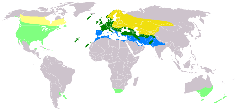 Обыкновенный скворец – космополитический тип пернатых, встречающийся во всех шести биогеографических регионах мира, за исключением (пока) неотропических районов. Рассеянные в основном по своему естественному палеарктическому региону (от Азорских островов на западе и центральной части Сибири на востоке до норвежской территории на севере и Средиземноморья на юге), скворцы были завезены на североамериканский континент в 1890 году.Из ста особей, выпущенных в Нью-Йорке, выжило только пятнадцать пар. В течение следующего столетия численность птиц увеличилось в миллион раз по сравнению с первоначальными пятнадцатью парами. Из-за широкого спектра экологической толерантности эти пернатые сумели стремительно расширить ареал распространения по всей территории США. Обыкновенный скворец встречается в настоящее время от Тихого океана до атлантического побережья (с запада на восток) и от Северной Мексики до южной части Канады (с юга на север).