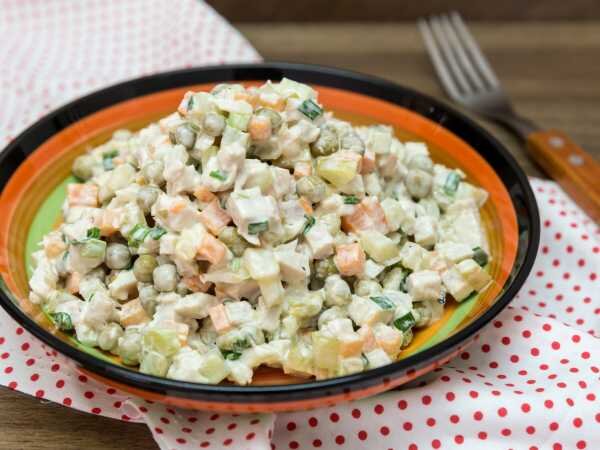 _Ингредиенты_: ✔️Мясо индейки - 300 г ✔️Огурцы соленые - 3-4 шт. ✔️Горошек консервированный - 1 банка ✔️Морковь - 1 шт. ✔️Лук репчатый - 0,5 шт. ✔️Майонез - по вкусу ✔️Перец черный молотый - по вкусу ✔️Лук зеленый - 0,5 пучок Маринад: ✔️Сахар - 0,5 ч.л. ✔️Соль - 0,5 ч.л. ✔️Уксус яблочный - 1 ст.л. ✔️Вода - 100 мл _Приготовление_:↩️ ⬇️ Мясо необходимо предварительно отварить и полностью остудить. А желательно отправить его в холодильник на пару часов: тогда оно будет легче резаться, кубики будут более аккуратными. Морковь тоже желательно предварительно отварить. ⬇️ Сначала подготовим лук, замаринуем его, чтобы ушла горечь. Все, что нужно для маринада, смешиваем, добавляем в смесь нарезанный мелко лук. Оставим на 5-10 минут. За это время вполне можно успеть нарезать все остальное. ⬇️ Мясо индейки нарежем кубиками. ⬇️ К нему отправляем нарезанные кубиками морковь и соленые огурцы. ⬇️ Из банки с горошком сливаем жидкость, добавим горошек в миску. Туда же отправим лук, с которого слив