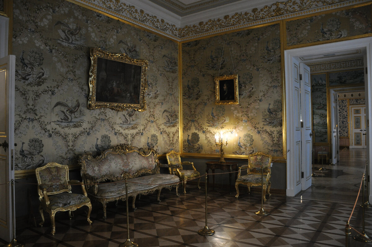 В Парадной гостиной торшеры и канделябры подлинные. Они сохранились благодаря тому, что были отправлены в эвакуацию. Обивка стен при реставрации была выполнена заново аналогично прежней. Мебель в комнате тоже подлинная. Часть ее была вывезена в эвакуацию, а несколько предметов были возвращены в 1947 году из Кенигсберга.