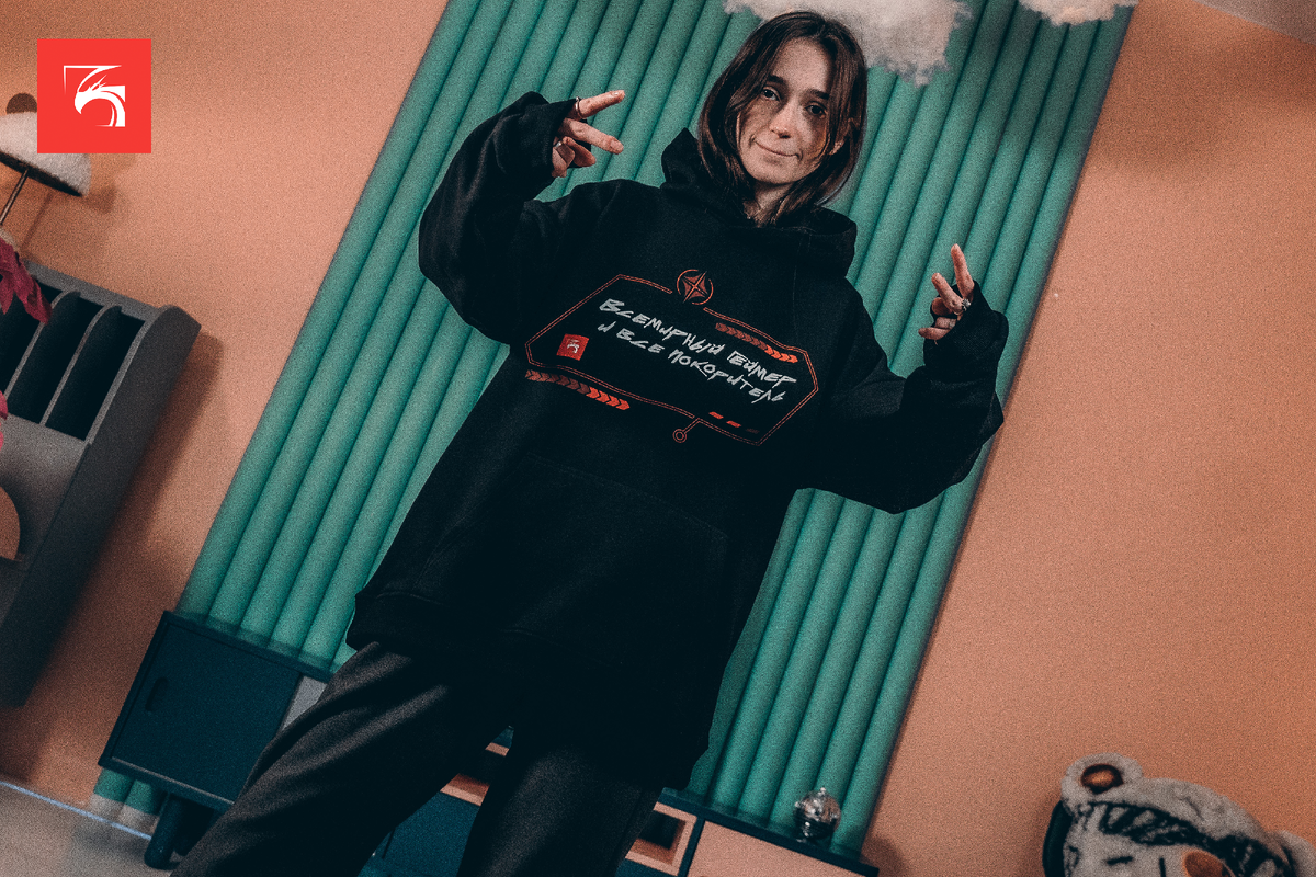 Провели фотосет, чтобы показать пример фасона худи оверсайз .Это тестовый дизайн с фразами, придуманные нейросетью.