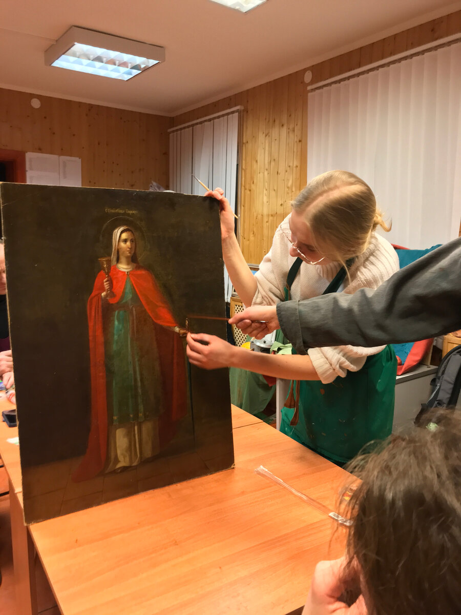 реставрационные практики, которых всегда мало, мало, мало. Что мне кажется самым важным при полноценном методологическом подходе и при нынешних сроках обучения: иметь перед глазами достойные образчики. Видеть и понимать, как это сделано. Уметь отследить стадии. Найти технические огрехи и их последствия. Вот тут мои прекрасные студенты спасают итальянизирующую ростовую св Варвару: А вот тут - который месяц подряд занимаются (разным составом ) реконструкцией двусторонней выносной иконой на металле. С точки зрения технологии всё это страшно полезно; Бог даст, эти люди никогда не станут писать ненадлежащими материалами на недолговечных основах, и перед их иконами люди будут молиться долго и радостно.