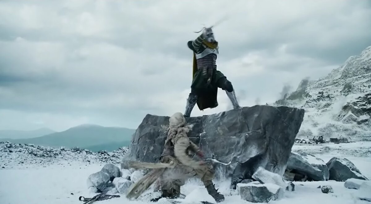 Заставка 7-ой серии посвящена одной из самых «интересных» маленьких битв сериала. Некая беременная воительница бежит от врагов (наверное, отступает, так как сзади, по всей видимости идет то ли сражение, то ли осада крепости – летают горящие камни.) На неё один за другим нападают воины в очень странных доспехах. У них есть шлемы (открытые и закрытые), поножи, и самое главное – какая-то наставка закрывает плечи и верхнюю часть груди, но при этом живот остается полностью открытым, на теле кожаный камзольчик. Чем воительница нахально пользуется – второго набегавшего она бьет пикой точно ниже уровня доспеха. Впрочем, этому второму доспех бы не помог, даже если бы опускался ниже пояса. Третий воин метает нож, воительница закрывается уже павшим вторым и кинжал легко пробивает доспех со спины. Далее женщину атакуют сразу трое, но только с одним она повторила ловкий прием, нанеся удар в незащищенное железом пузо. С остальными и так справилась. Тут я остался в легком недоумении. По рыжим волоса