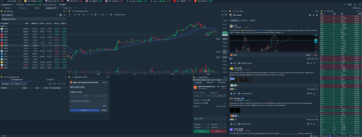 В предыдущей статье говорил о Дивидендом портфеле на 2023 год. Сегодня покажу, как выглядит терминал Тинькофф, как он настроен у меня. И как легко отслеживать весь список перспективных компаний. Сам терминал открывается в браузере. И сам по себе напоминает браузер. Он легко настраивается под ваши задачи и желания. Терминал позволяет создавать дополнительные вкладки. Для примера добавил Дивиденды ТОП 15 и Стальной мир. В закладке Дивиденды ТОП 15 - компании о которых говорил в предыдущей статье, а в закладке Стальной мир - Металлургические компании страны. Каждая закладка содержит дополнительные виджеты: Все виджеты связаны между собой. В одном окне удобно прощелкать все компании, просмотреть обсуждения и новости по каждой (открывается в виджете Пульс). Обратить внимание на график. И когда приходит понимание, по какой цене готов приобрести лот, ставлю уведомления. Все уведомления приходят в телефон. С компьютера удобнее оценить весь рынок одним взглядом. Понять что происходит, понаблюд