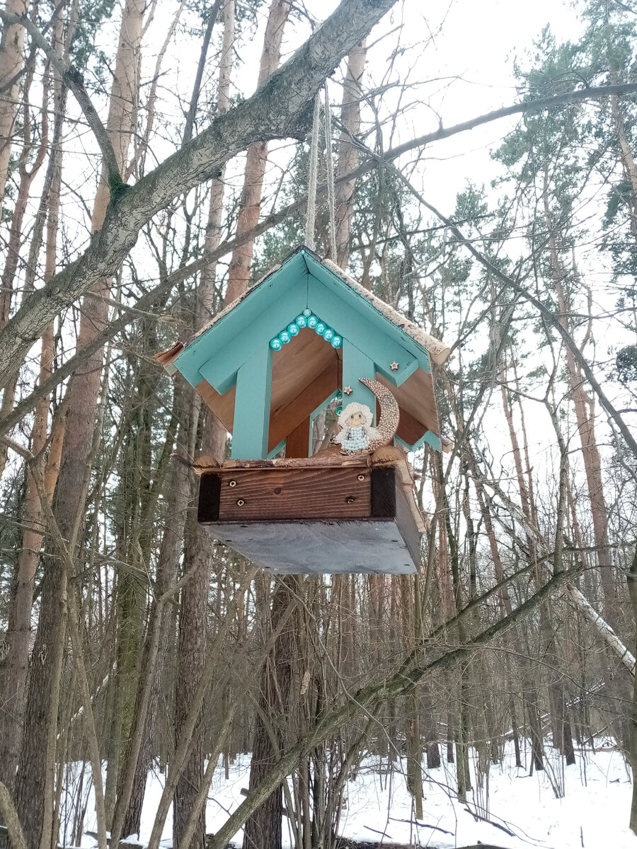 Честно говоря, когда я увидела первую порадовавшую меня кормушку, мне было немножко лень переключать мой телефон из режима плеера в режим фотокамеры, потому что музыка при этом отключается. Но после второй и третьей кормушки я поняла, что всё-таки их надо фотографировать, потому что этим зрелищем хочется поделиться с людьми!