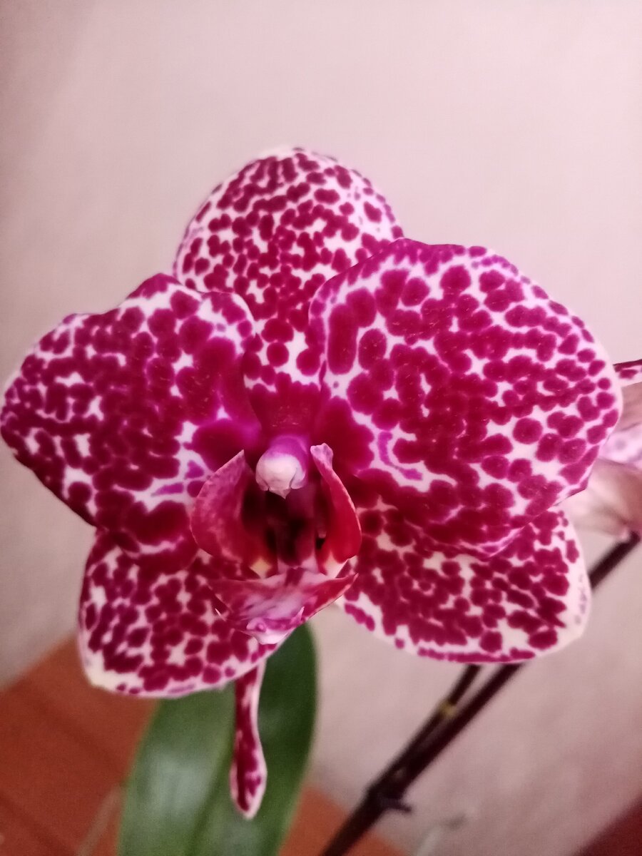 В коллекции каждого орхомана, думаю, есть эта орхидея. Она относится к редким сортам. Хотя сейчас ее можно найти в интернет магазинах, иногда они попадают в миксовку в сетевых магазинах. Года три назад я по настоящему охотилась за этой орхидеей. Сначала приобрела две детки в размере 1.7. Затем повезло купить цветущее взрослое растение. Сейчас у меня в коллекции четыре "Диких кота". Это первый год, когда они цветут одновременно. Этот "Дикий кот" - первый из приобретенных цветущих. Из - за некорректной транспортировки ( растение плохо закрепили ) орхидея очень долго адаптировалась, стрессанула так сильно, что я переживала, что потеряю растение. Она сбросила все цветы, листья потеряли тургор, часть корневой системы тоже были потеряны. Восстанавливалась она очень медленно. Это ее второе цветение. Цветочки пока не очень крупные - 6 см. Надеюсь, что будет доращивать цветонос. Думаю, что она уже полностью восстановилась. Эти две орхидеи - из размера 1.7 выросли и в этом году дали первое дом