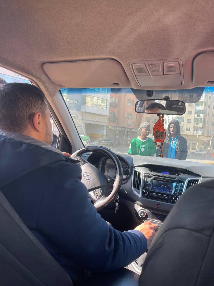 Тем не менее, мы вызвали такси, вбили адрес стадиона и увидели, что ехать нам 30 минут. Эти полчаса были одними из самых жутких за время путешествия в Марокко. Оказалось, что стадион находится в одном из самых неблагополучных районов Касабланки. Посреди дороги на месте, где должны быть трамвайные пути, оказался разложен километровый микрогород из мусорных пакетов, бутылок и грязи.